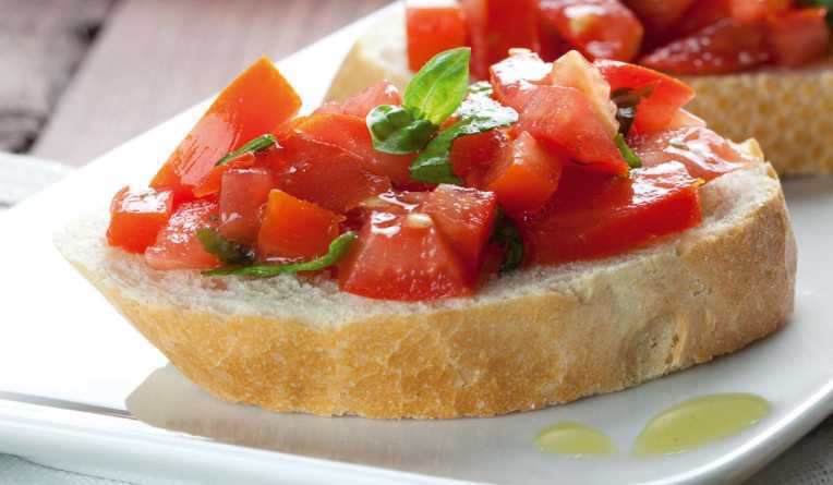 Prendere un piatto da portata, sistemare le fettine di pane, adagiare il preparato di pomodori e cipolla. Aggiungere un filo di oro giallo di tartufo nero per dare un tocco finale di profumo e colore.