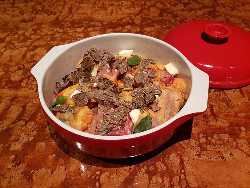 Sul fondo di una capiente terrina da forno, dopo aver messo lo spicchio d’aglio in camicia e le foglie di salvia, si dispongono i pezzi di faraona nei quali saranno state inserite delle lamelle di tartufo nero tra la pelle e la carne.