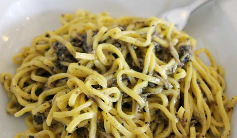 180 gr di fettuccine, una noce di burro o un cucchiaio di olio di oliva, panna, sale, 1 vasetto di nero in crema da 45 gr.